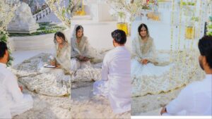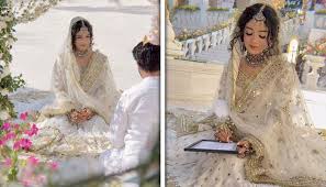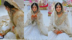 کے تلے اور شیشے کی کڑھائی والی سفید رنگ کی انارکلی جب کہ ان کے شوہر نے سفید رنگ کی سادہ شلوار قمیض پہننے کا انتخاب کیا۔وہ انارکلی میں گھنگھریالی لٹوں اور بندھے بالوں کے ساتھ روایتی میچنگ جیولری پہنے بہت ہی دلکش لگ رہی ہیں۔