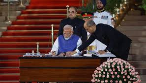 کیا گیا تھا، اجلاس میں نریندرا مودی کو متفقہ طور پر این ڈی اے اور بی جے پی کا لیڈر منتخب کیا گیا، مودی کو بی جے پی پارلیمانی بورڈ کا لیڈر بھی منتخب کیا گیا، جس کے بعد بھارتی صدر دروپدی مرمو نے مودی کو حکومت سازی کی دعوت دی۔مودی کی نئی حکومت کا قیام بہار کے وزیر اعلیٰ نتیش کمار کی قیادت میں جنتا دل (یونائیٹڈ) اور چندرا بابو نائیڈو کی زیر قیادت تیلگو دیشم پارٹی کی حمایت پر منحصر ہے۔بھارتی میڈیا کے مطابق مودی کی اتحادی جماعتیں، خاص طور پر تیلگو دیشم پارٹی (ٹی ڈی پی) اور جنتا دل (یونائیٹڈ) ایوان زیریں میں اسپیکر کے عہدے پر نظریں جمائے ہوئے ہیں، جبکہ بی جے پی 4 اہم وزارتیں اپنے پاس رکھے گی جن میں وزارت خارجہ، دفاع، داخلہ اور خزانہ شامل ہیں۔تاہم نریندر مودی کی پارٹی نے یہ ظاہر نہیں کیا ہے کہ اتحادی ارکان کو ان کی حمایت حاصل کرنے کے لیے کیا رعایتیں دی گئی ہیں لیکن کئی بڑی جماعتوںکو اہم وزارتوں کے قلمدان دئے جانے کا امکان ہے