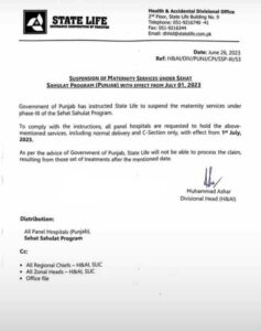 اسٹیٹ لائف انشورنس کا کہنا تھاکہ پنجاب حکومت نے مریضوں سے30 فیصد پیسے چارج کرنےکی سفارش کی ہے لہٰذا پنجاب میں مستحق افراد کے تعین تک کارڈیک سروسز صحت کارڈ پر نہیں ہوں گی۔اسٹیٹ لائف انشورنس کے مطابق یکم جولائی کے بعد دل کے امراض کےعلاج پر نجی اسپتالوں کو ادائیگی نہیں ہو گی۔اس کے علاوہ اسٹیٹ لائف انشورنس نے امراض قلب کے بعد نجی اسپتالوں میں صحت کارڈ پر زچگی کےعلاج کی سہولت بھی بند کردی۔اسٹیٹ لائف نے صحت کارڈ پینل کے نجی اسپتالوں کومفت زچگی علاج بند کرنے کی ہدایت کی اور مراسلے میں کہا ہے کہ اسٹیٹ لائف انشورنس کے نجی اسپتالوں کو مراسلے کا اطلاق یکم جولائی سے ہے۔مراسلے کے مطابق نارمل ڈلیوری یا سی سیکشن پر اسٹیٹ لائف کوئی ادائیگی نہیں کرے گا۔