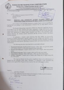 کو ارسال کیا ہے جس میں کہا گیا ہے کہ منشیات کے عادی افراد کی جانب سے شہر کے انفراسٹرکچر کو نقصان پہنچانے میں نمایا اضافہ ہوا ہے،لیٹر میں کہا گیا ہے کہ اس حوالے سے متعدد مرتبہ متعلقہ پولیس کو شکایات اور ایف آئی آر کا اندراج بھی کرایا گیا ہے لیکن انفراسٹرکچر کو نقصان پہنچانے کا سلسلہ نہیں رک سکا ہے ۔میونسپل کمشنر کراچی کی جانب سے بھیجے گئے لیٹر میں مختلف مقامات کا ذکر کرتے ہوئے بتا یا گیا ہے جس میں سہراب گوٹھ انڈر پاس میں لائٹس ،کیبلز کی چوری کی وجہ سے مسلسل اندھیرا پھیلا ہوا ہے،غریب آباد انڈر پاس سے پمپ کیبلز اور ٹنل لائٹس کی چوری کرلی گئی ہیں،لیاقت آباد انڈر پاس سے 280لائٹس،کیبلز اور پمپ چوری کرلئے گئے ہیں،گولیمار انڈر پاس سے پائپ فٹنگ،لائٹس چوری کی جاچکی ہیں،شہر کے انفراسڑکچر
