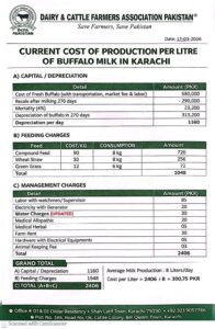 لاگت تقریباً 300.75 روپے بنتی ہے۔ایسوسی ایشن نے اس امر پر شدید تشویش کا اظہار کیا ہے کہ جانوروں کی خوراک (ونڈا، بھوسہ، سبز چارہ) کی قیمتوں میں مسلسل اضافہ ہے- بجلی، فیول اور پانی کے اخراجات میں اضافہ ہو گیا ہے- لیبر اور ویٹرنری اخراجات میں نمایاں اضافہ ہوا ہےنے ڈیری فارمنگ کو شدید مالی بحران سے دوچار کر دیا ہے۔اس کے باوجود، فارمرز کو سرکاری طور پر کم قیمت پر دودھ فروخت کرنے پر مجبور کیا جا رہا ہے، جو کہ سراسر ناانصافی ہے اور فارمرز کے معاشی استحکام کو تباہ کر رہا ہے۔ڈیری اینڈ کیٹل فارمرز ایسوسی ایشن کے مطالبات کے مطابق دودھ کی قیمت کا فوری تعین حقیقی