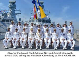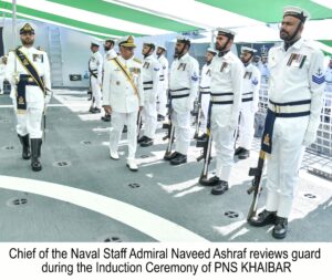 دوران پاک بحریہ بھارتی طیارہ بردار جہاز کو غرق کرنے کے لیے بالکل تیار تھی جس نے بھارتی بحریہ کو اپنی محفوظ پناہ گاہوں تک محدود رہنے پر مجبور کر دیا۔ انہوں نے کہا کہ معرکہ حق کے دوران بحری آپریشنز کی مہارت اور طرزِ عمل یہ واضح پیغام دیتا ہے کہ پاکستان کے بحری مفادات کو چیلنج کرنے کی کسی بھی کوشش کا بھرپور جواب دیا جائے گا۔ ایڈمرل نوید اشرف نے مزید کہا کہ پاک بحریہ کو دشمن کی اہم تنصیبات اور بحری اثاثوں کو نشانہ بنانے کے لیے جدید ترین پلیٹ فارمز اور مخصوص ٹیکنالوجیز سے لیس کیا جا رہا ہے۔ پی این ایس خیبر جیسے جدید پلیٹ فارمز اور مستقبل میں شامل ہونے والی ہنگور کلاس آبدوزیں پاک بحریہ کی جدت میں ایک سنگ میل ہیں، جو آپریشنل استعداد، جنگی قوت اور تزویراتی رسائی کو مزید وسعت دیں گیں۔اپنے خطاب کے اختتام پر نیول چیف نے پی این ایس خیبر کے عملے کے لیے نیک خواہشات کا اظہار کیا اور سمندری حدود کے محافظ کے طور پر خودمختار سمندروں کے دفاع اور اپنی ذمہ داریوں کو نبھانے کے پاک بحریہ کے عزم کا اعادہ کیا