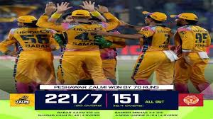 آباد یونائیٹڈ کی ٹیم 151رنز پر ڈھیر ہوگئی۔ اسلام آباد یونائیٹڈ نے ٹاس جیت کر پشاور زلمی کو پہلے بیٹنگ کی دعوت دی، زلمی نے مقرر20 اوورز میں 7 وکٹوں کے نقصان پر 221 رنز بنائے۔کپتان بابر اعظم نے پی ایس ایل میں اپنی چوتھی سنچری اسکور کی۔ وہ 103 رنز بنا کر آؤٹ ہوئے، ان کی اننگز میں4چھکے اور 12 چوکے شامل تھے۔ کوشل مینڈس 41، محمد حارث 35 اور ایرون ہارڈی 20 رنز بنا کر نمایاں ہے۔ اسلام آباد یونائیٹڈ کی جانب سے شاداب خان نے 3 وکٹیں لیں، رچرڈ گلیسن نے دو جبکہ سلمان مرزا اور فہیم اشرف نے ایک ایک وکٹ لی۔ہدف کے تعاقب میں یونائیٹڈ کا آغاز جارحانہ رہا جہاں پہلی وکٹ پر ڈیون کونوے اور سمیر منہاس نے 58 رنز کی پارٹنرشپ بنائی۔پانچویں اوور کے اختتام پر ڈیون کونوے